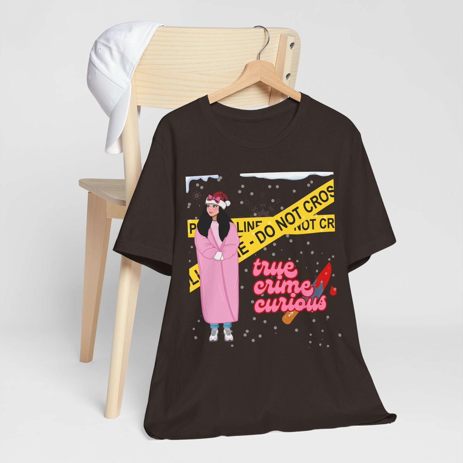 True crime fanatics, your investigation into stylish apparel stops here. This limited-edition tee is a must for anyone who can't resist the lure of a juicy mystery. Its playful "True Crime Curious" design speaks to the amateur sleuth in all of us while looking effortlessly chic. Made from a soft cotton blend, it's the perfect cozy layer for binging true crime docs from the comfort of your couch. With its punny text and whimsical graphic, this quirky top is sure to spark conversation with fellow nerds and armchair detectives. So go ahead and indulge your curiosity—just don't leave the house without this clever tee. Whether you're theorizing over a cold case or simply running errands, it's a stylish reminder that every day is an adventure when you see the world through crime-colored glasses.