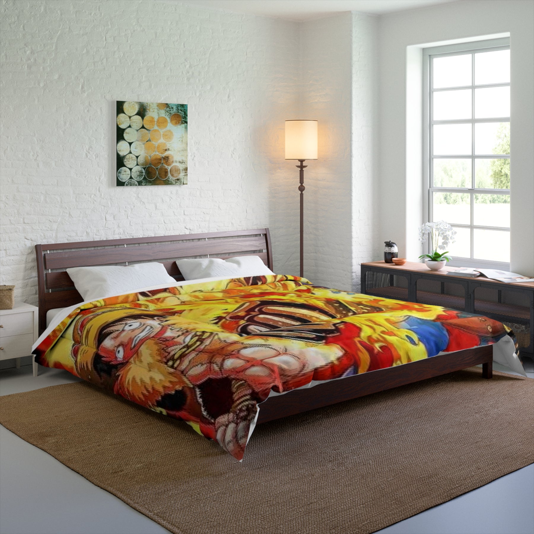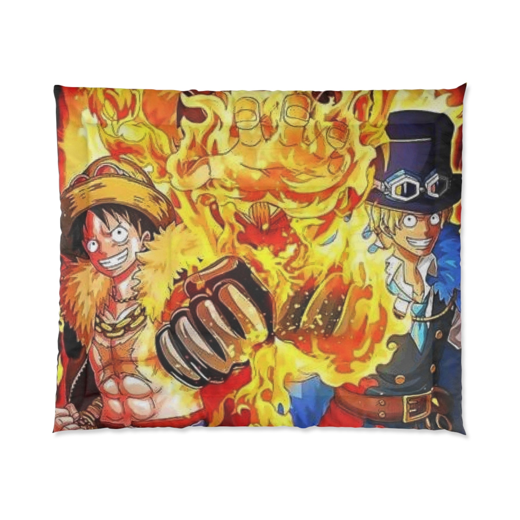 The sample shows two brothers Luffy and Sabo in flames of fire.  Transform your bedroom into a vibrant sanctuary with this stunning comforter.  Featuring dynamic artwork that bursts with energy, this piece is perfect for anyone looking to add a playful touch to their space. Its lightweight yet cozy material ensures comfort throughout all seasons, making it ideal for cozy nights and refreshing mornings alike. Whether you’re a fan of adventurous themes or simply want to express your unique style, this comforter fits seamlessly into your life. It's a great gift for teenagers and young adults, especially around birthdays, holidays, or even as a fresh back-to-school item!