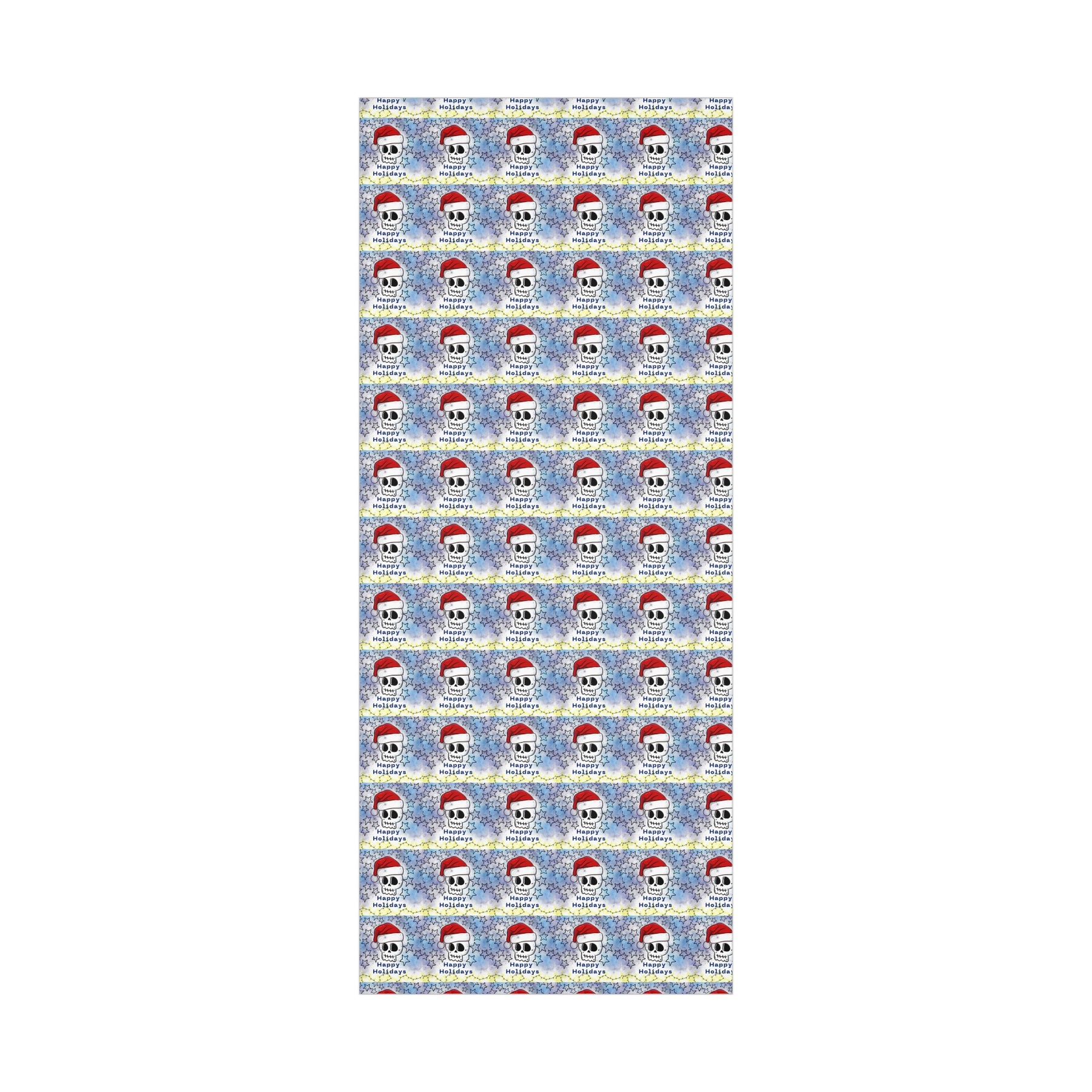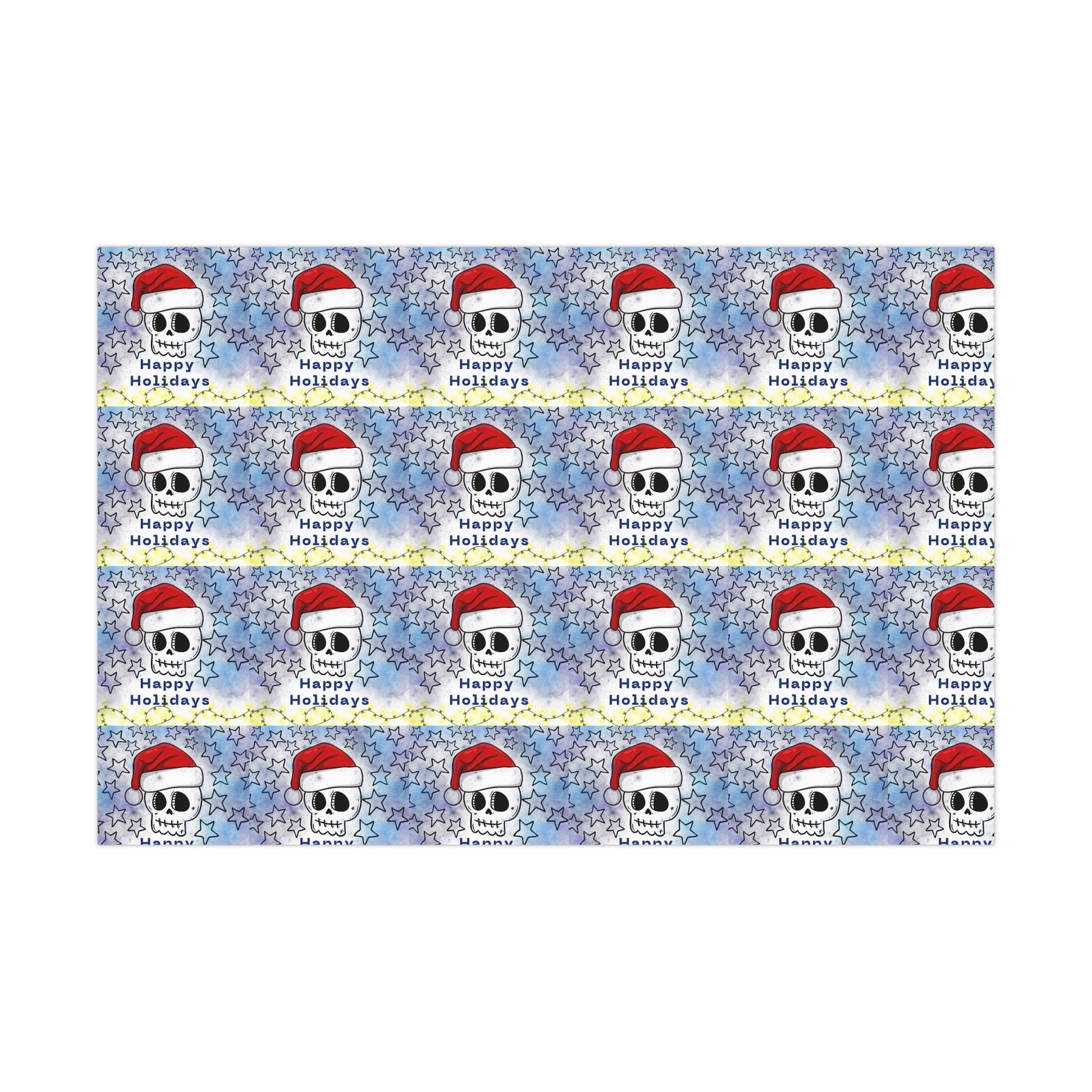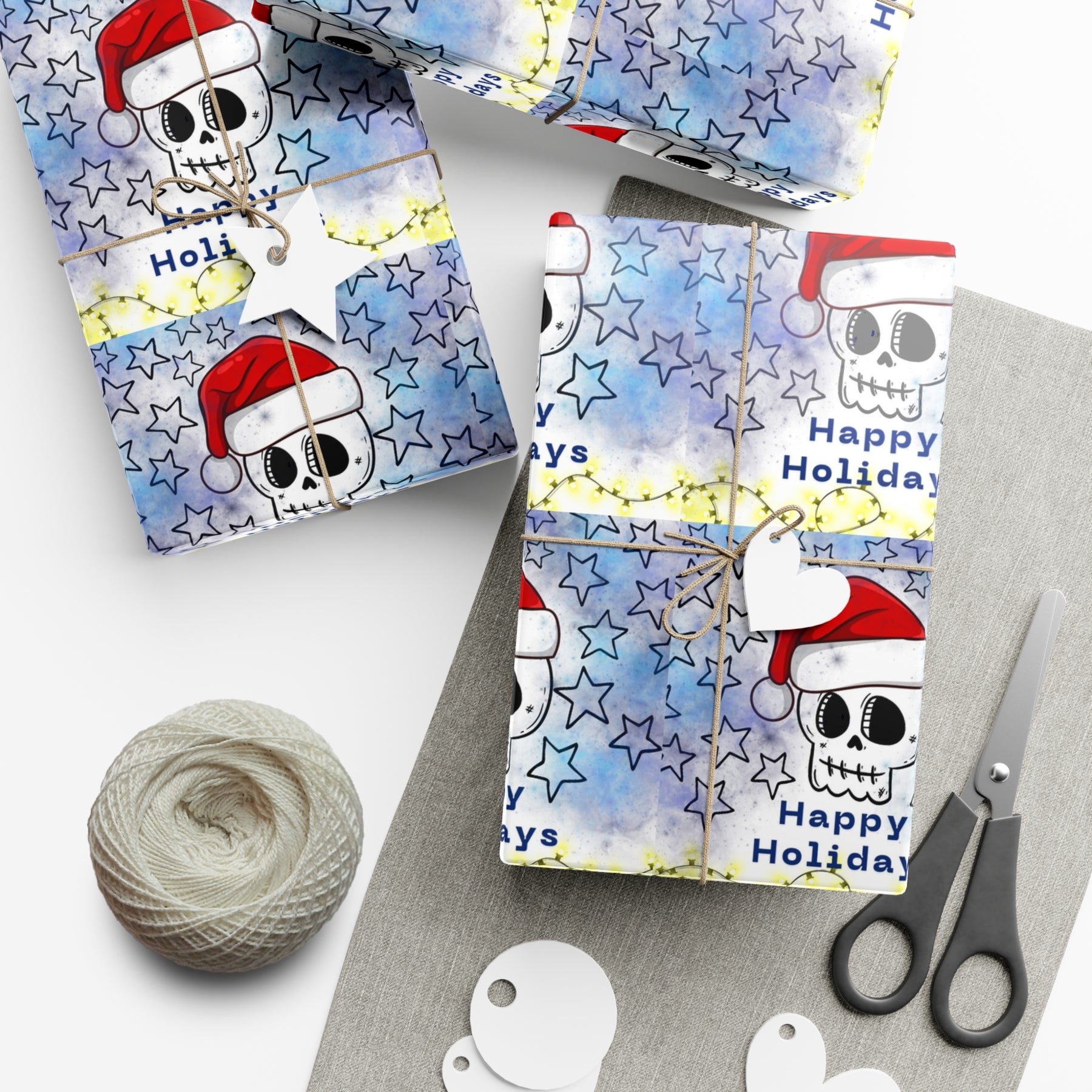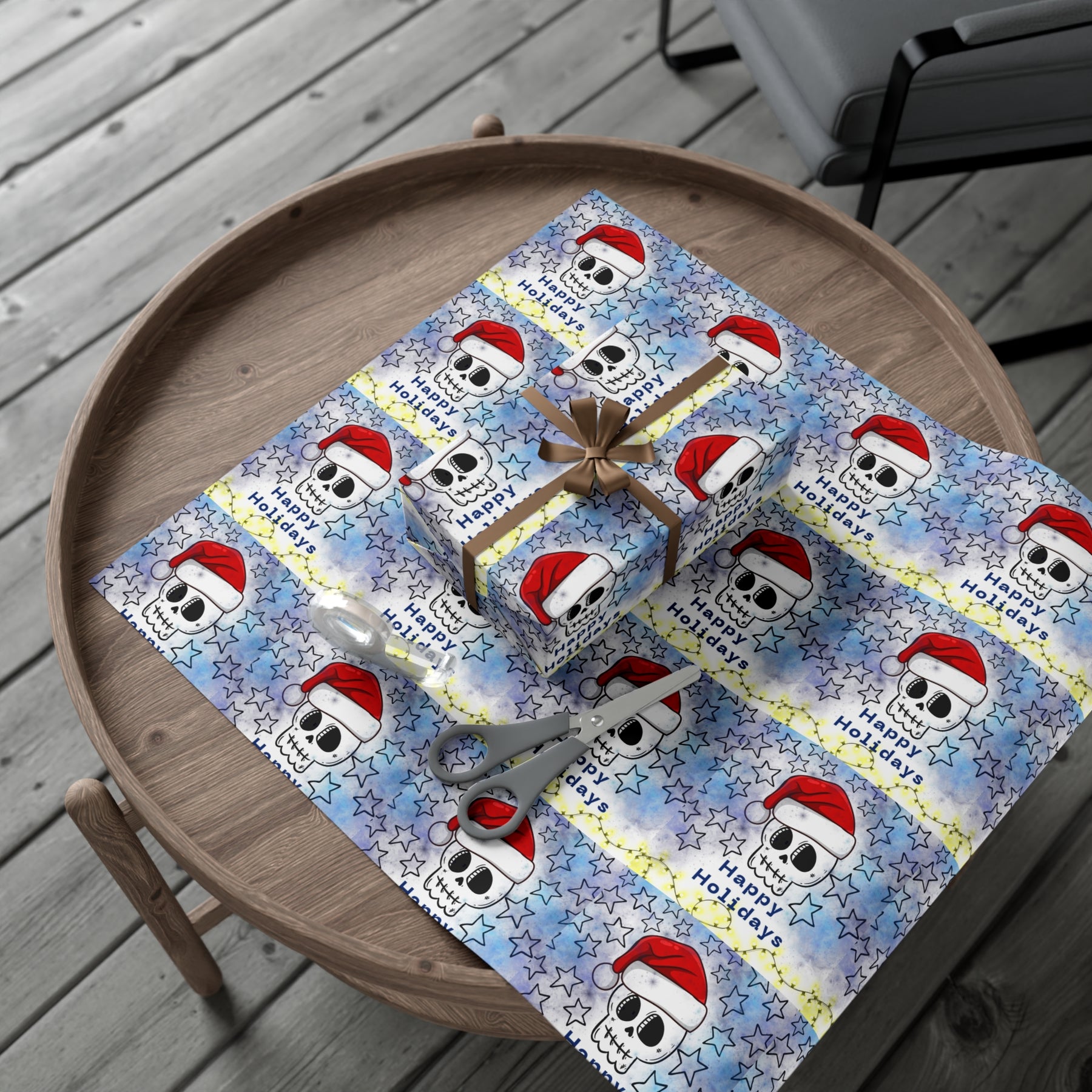 Gift wrap paper with a blue background, white stars, skulls wearing Santa hats, and "Happy Holidays" text.