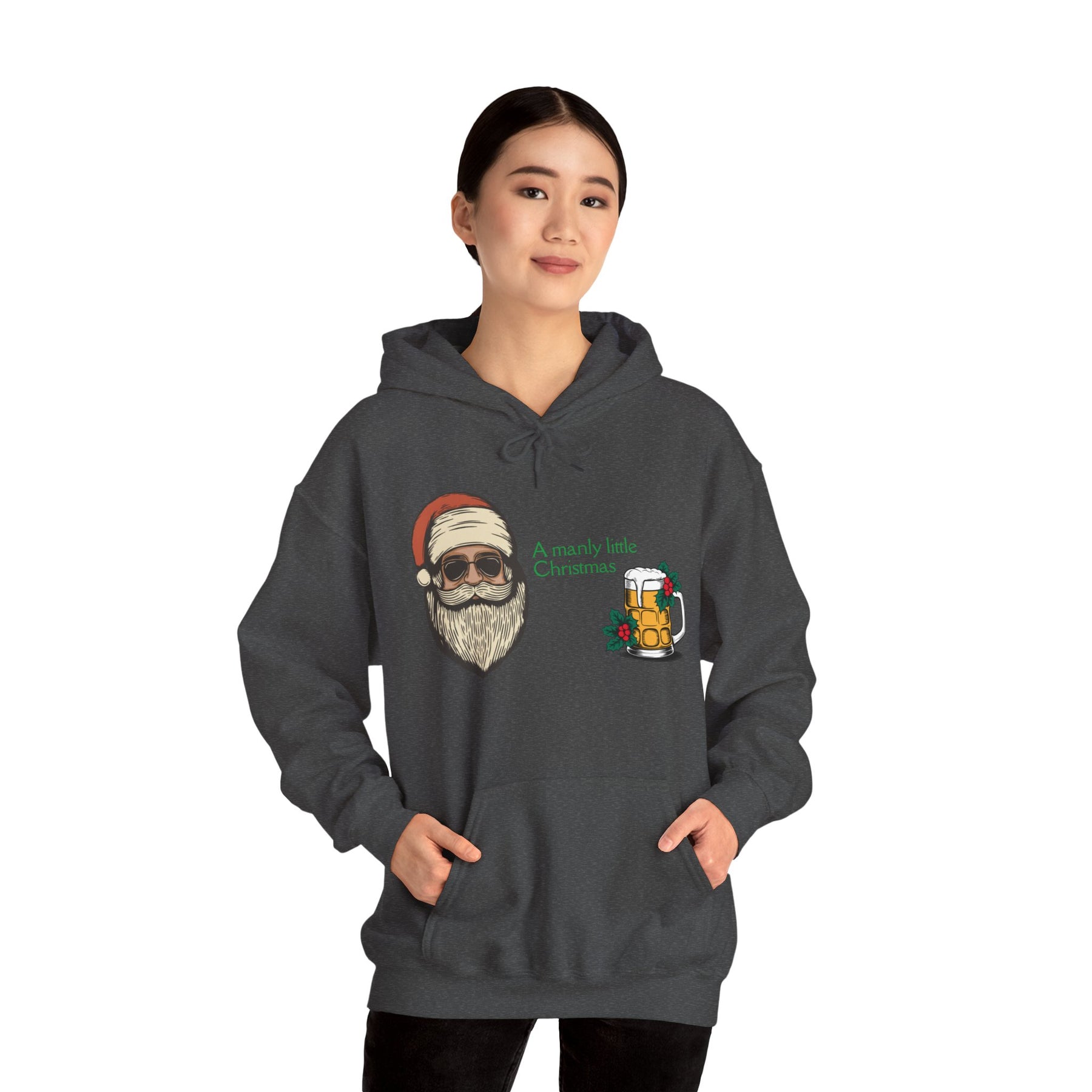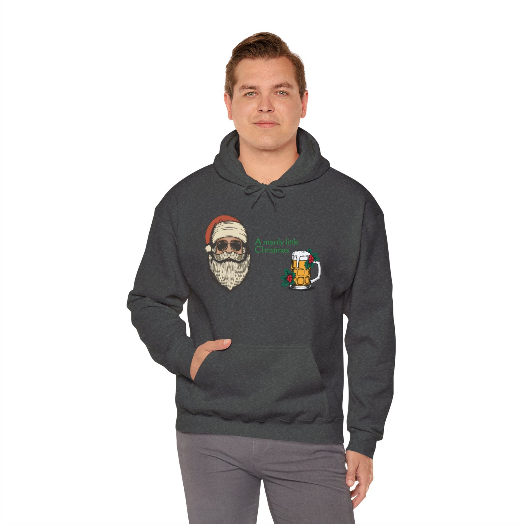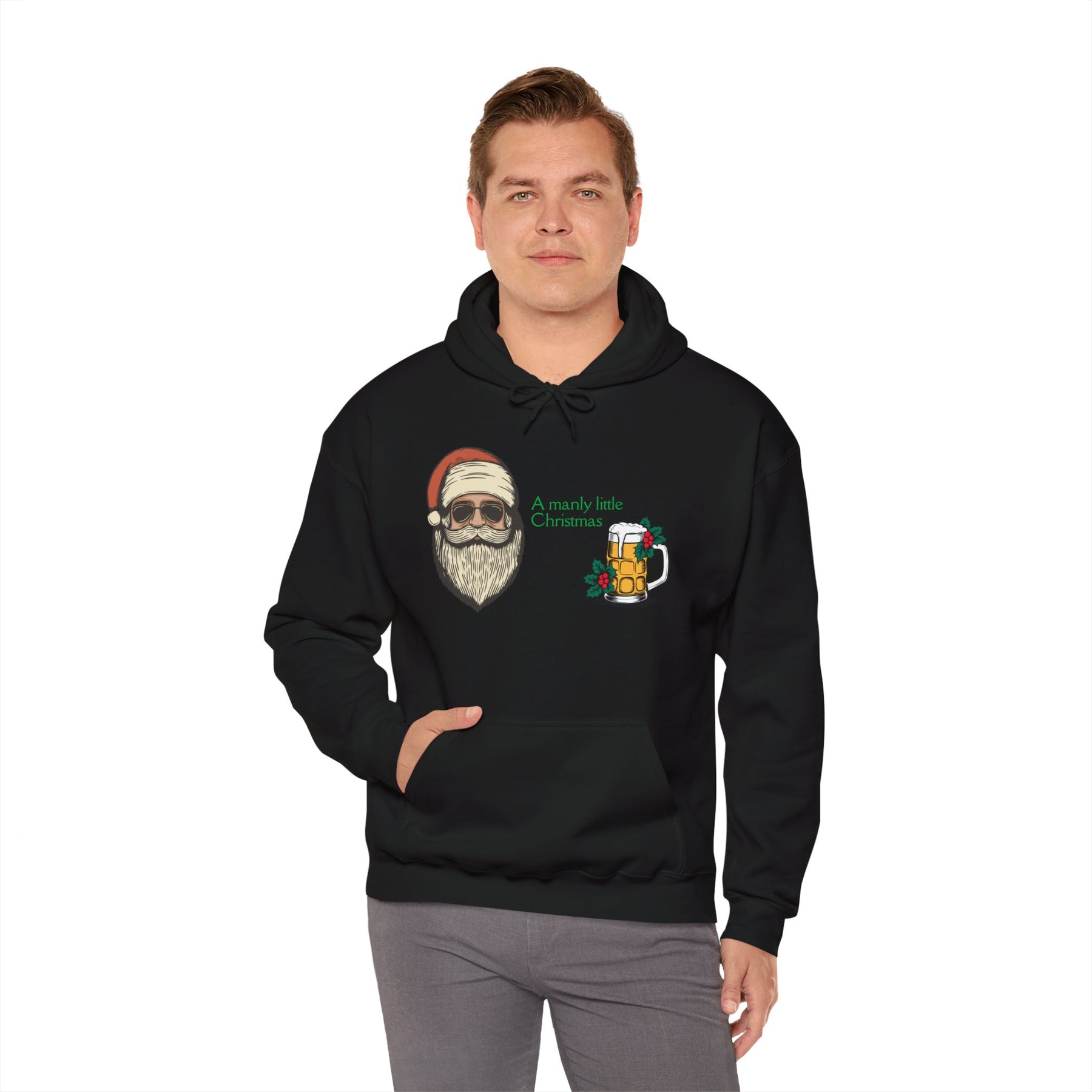 Black hoodie with a graphic of a cool Santa, a beer mug, and text that says "A manly little Christmas".