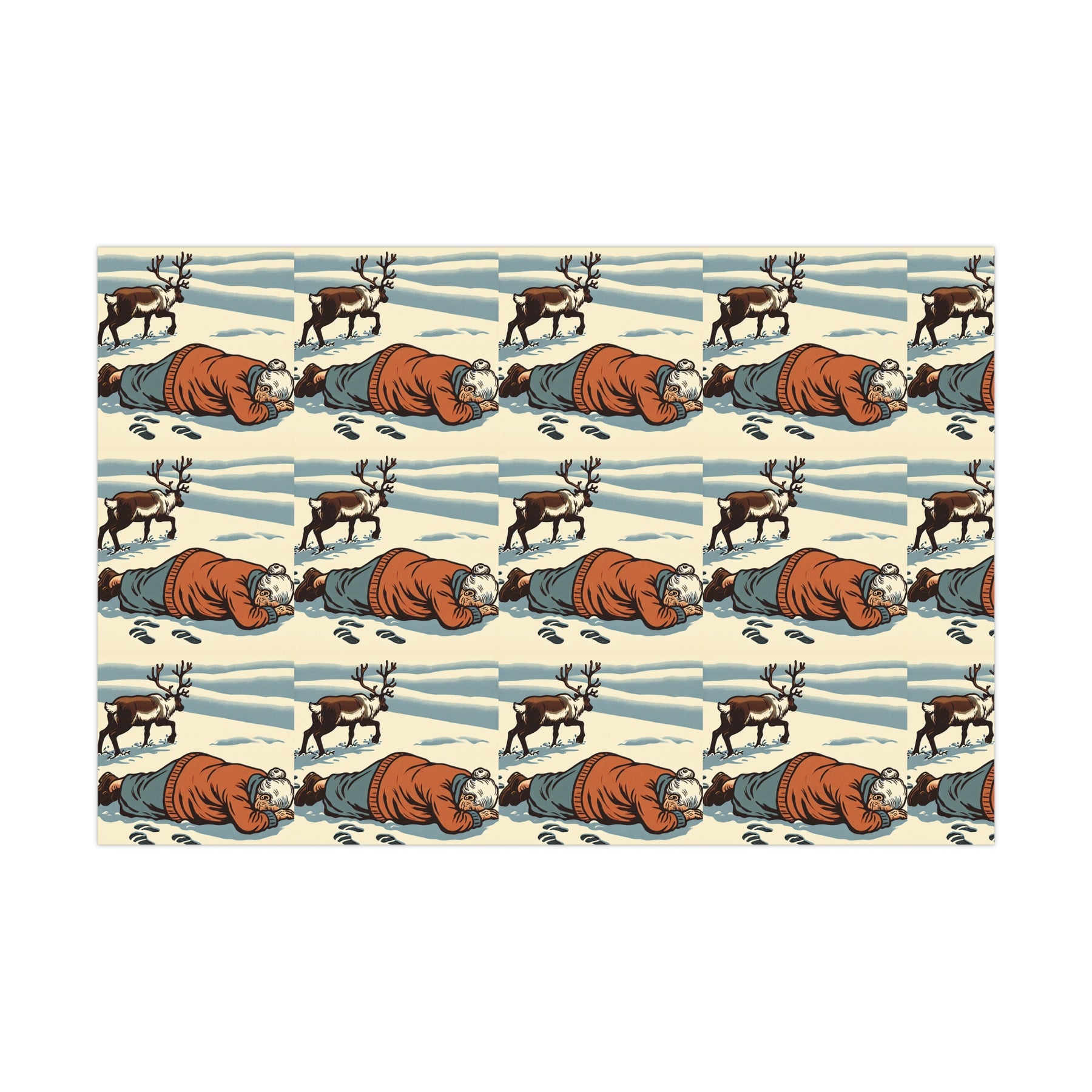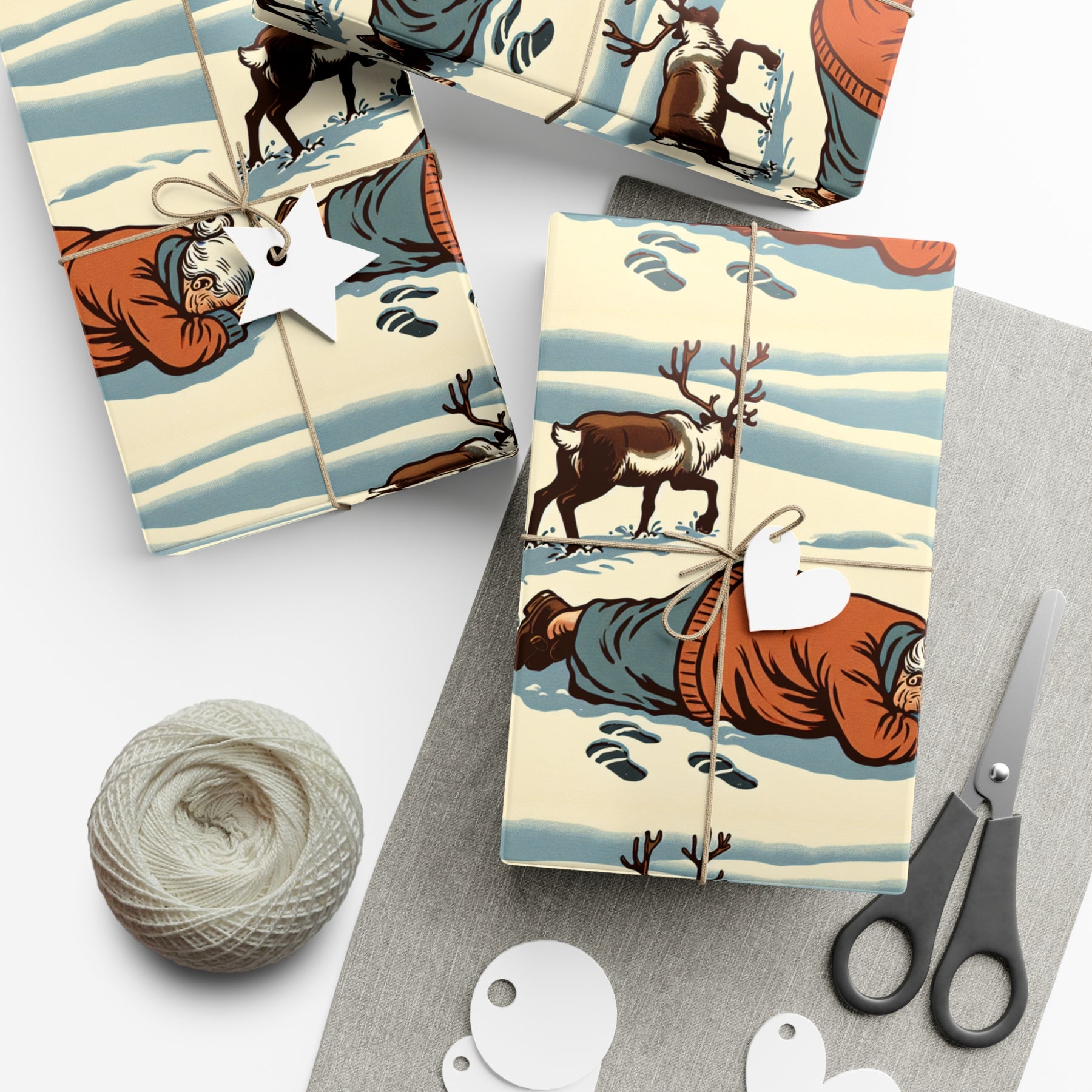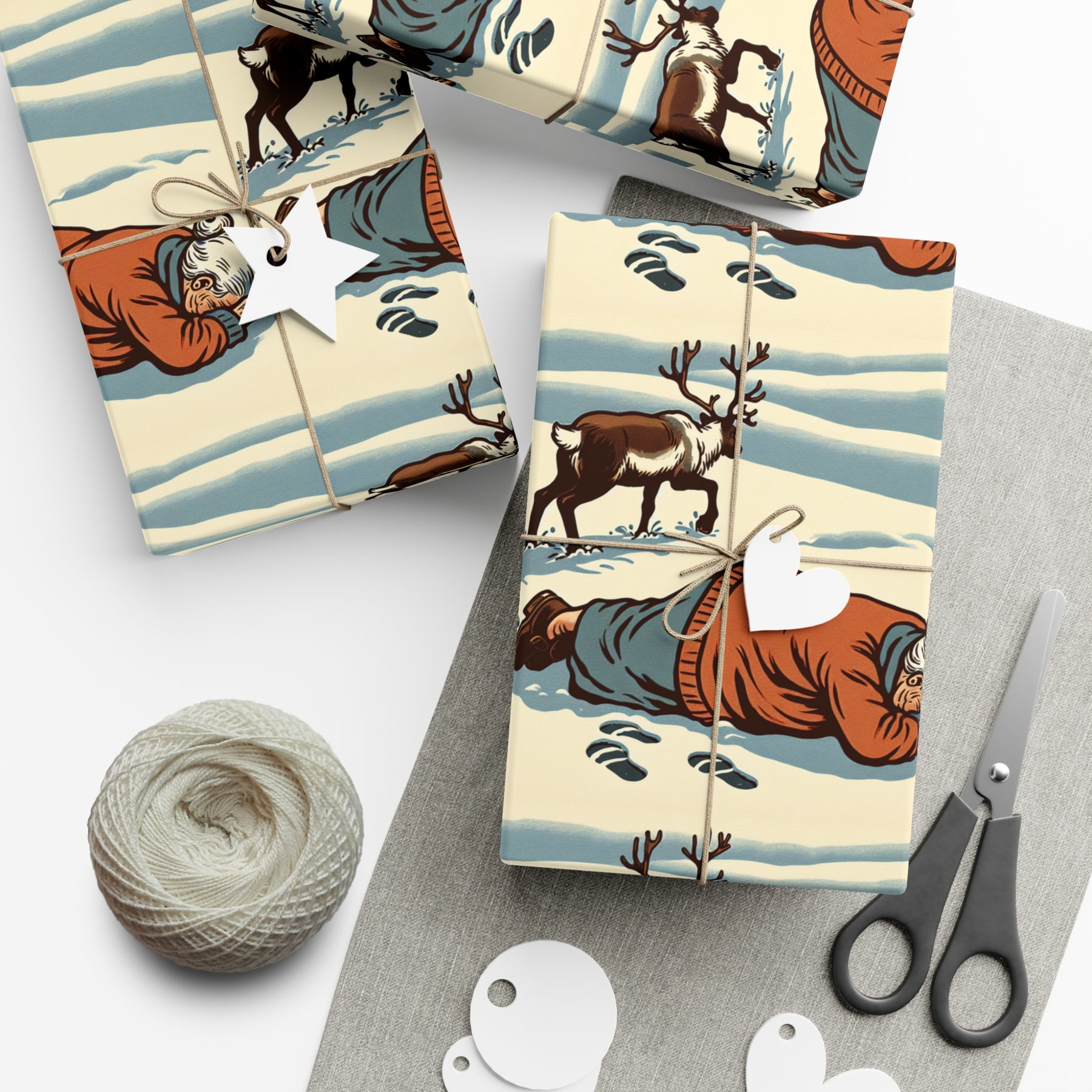 Wrapping paper with a repeating pattern of a person lying in the snow with reindeer.