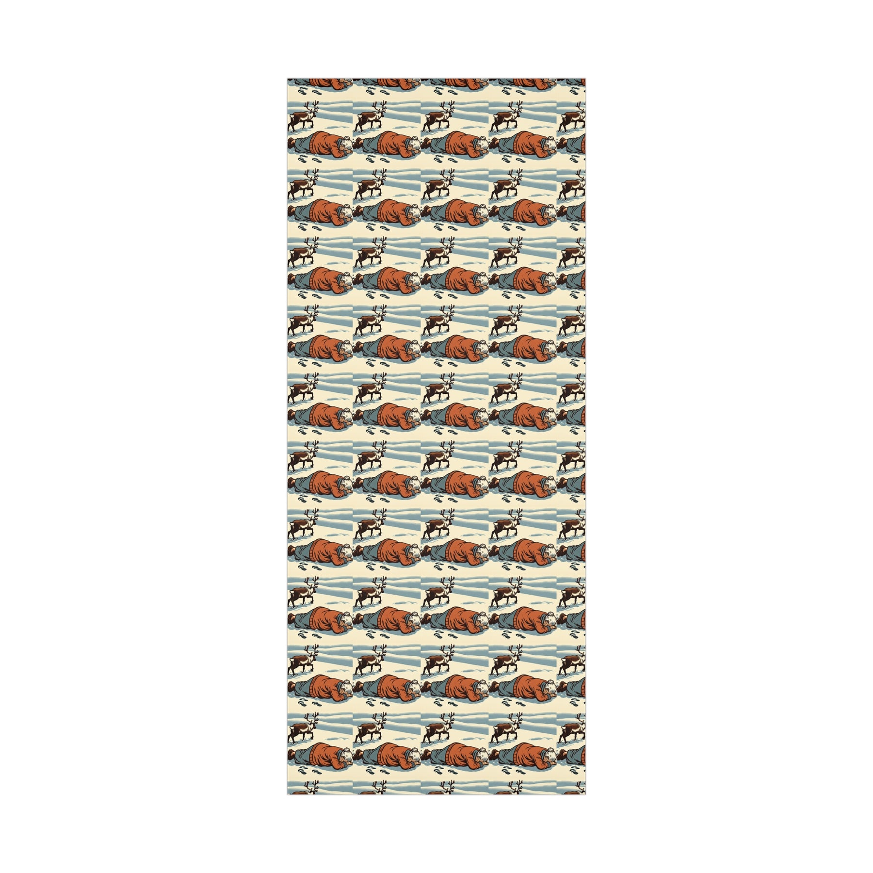 Wrapping paper with a repeating pattern of a person in a red coat and a reindeer in the snow.