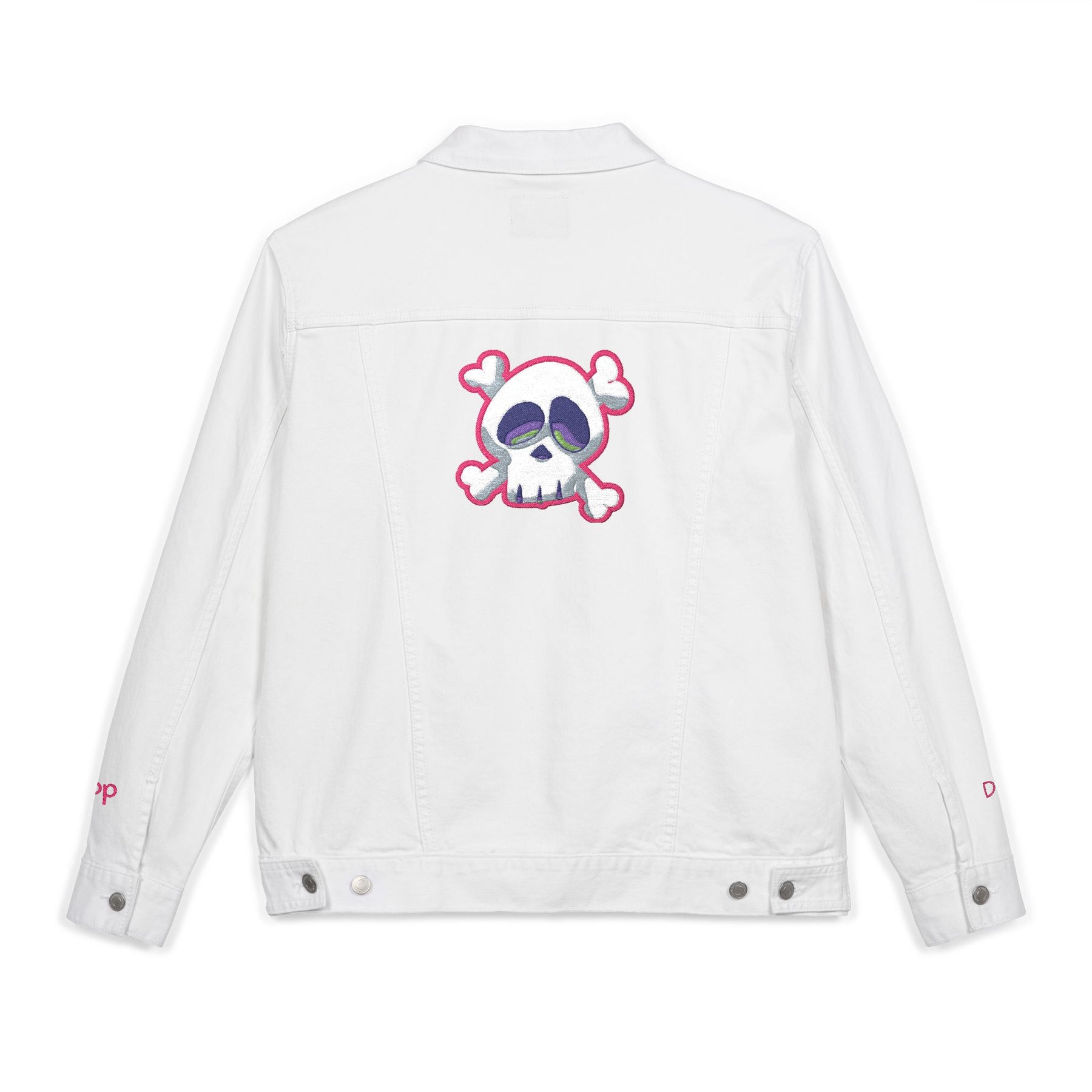 Embroidered Drop Dead Pink Punk Skull Denim Jacket – A bold statement piece for those who live unapologetically. Crafted from premium, durable denim, this jacket features an eye-catching embroidered pink punk skull on the back, blending rebellious streetwear vibes with high-fashion edge.