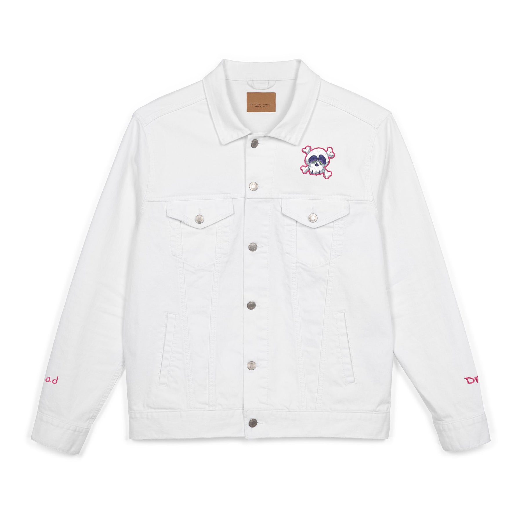 "Embroidered Drop Dead Pink Punk Skull Denim Jacket – edgy streetwear fashion for punk and rock lovers"