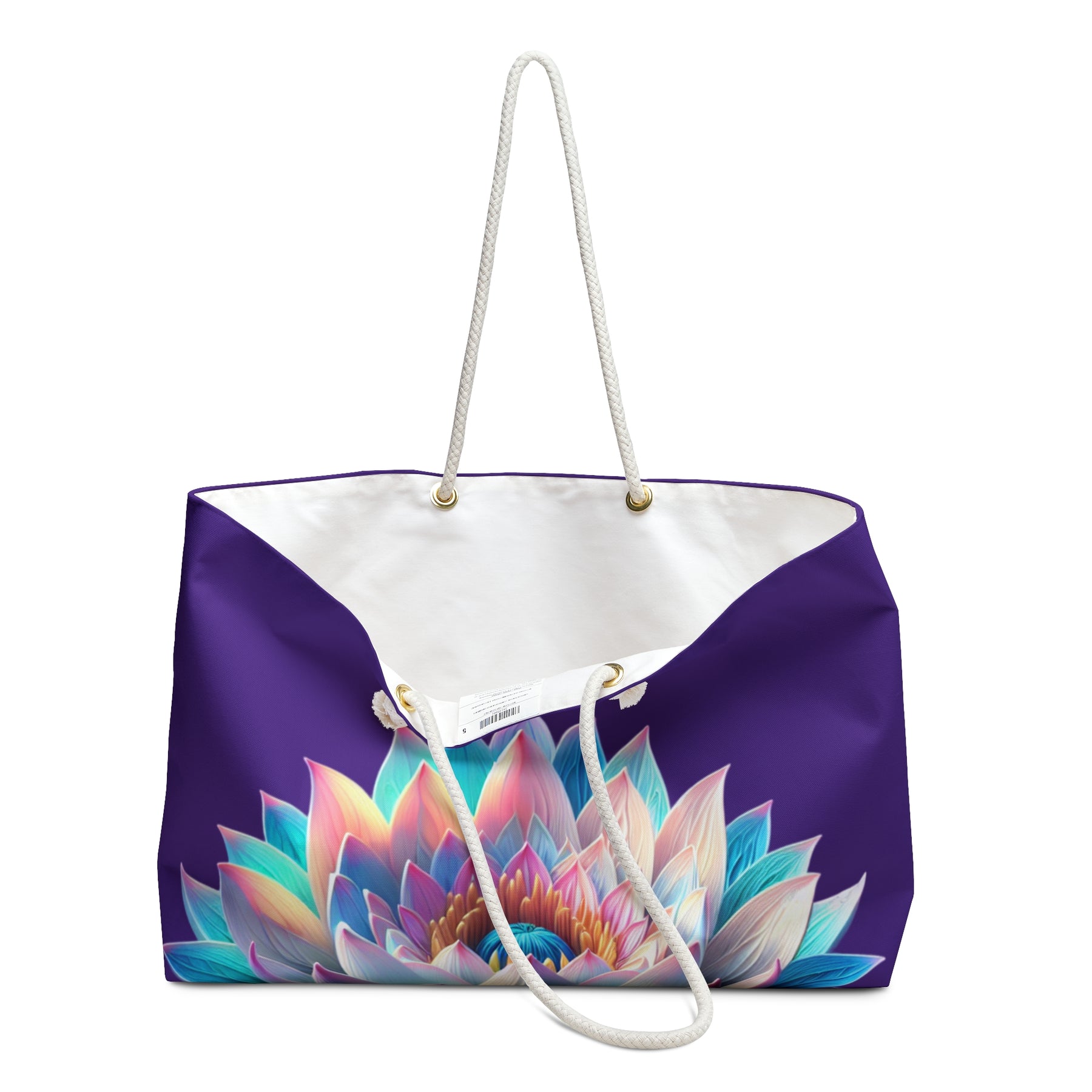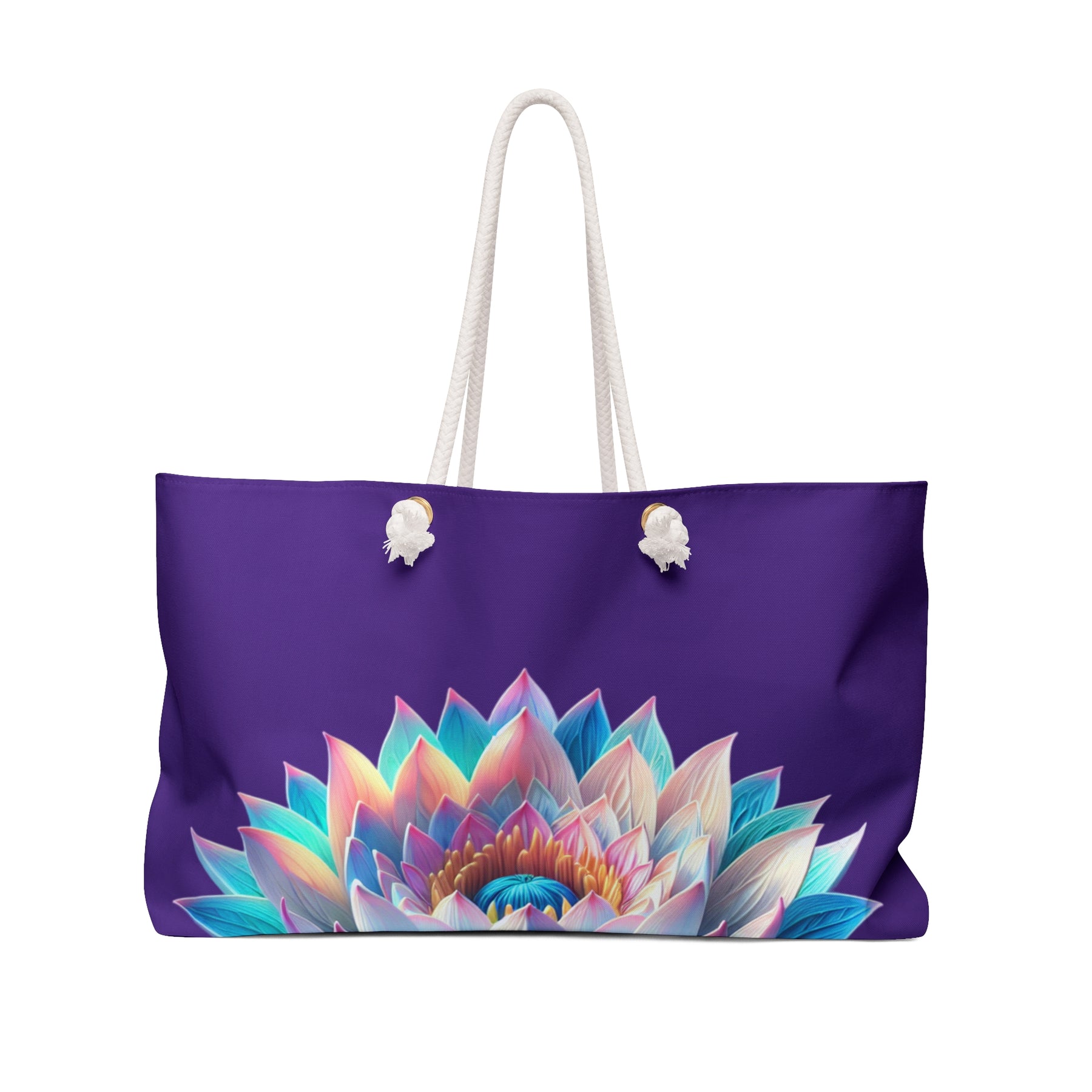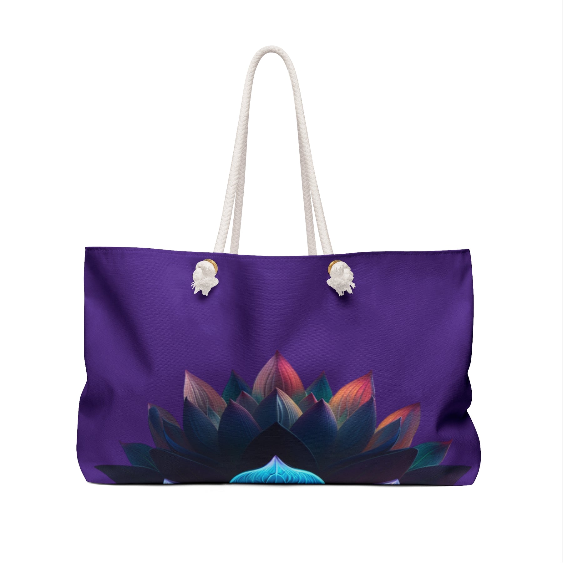 Tote Bag: Priti’s Colorful Lotus Reflection Weekender Bag in Deep Purple - Perfect for Travel & Yoga Retreats