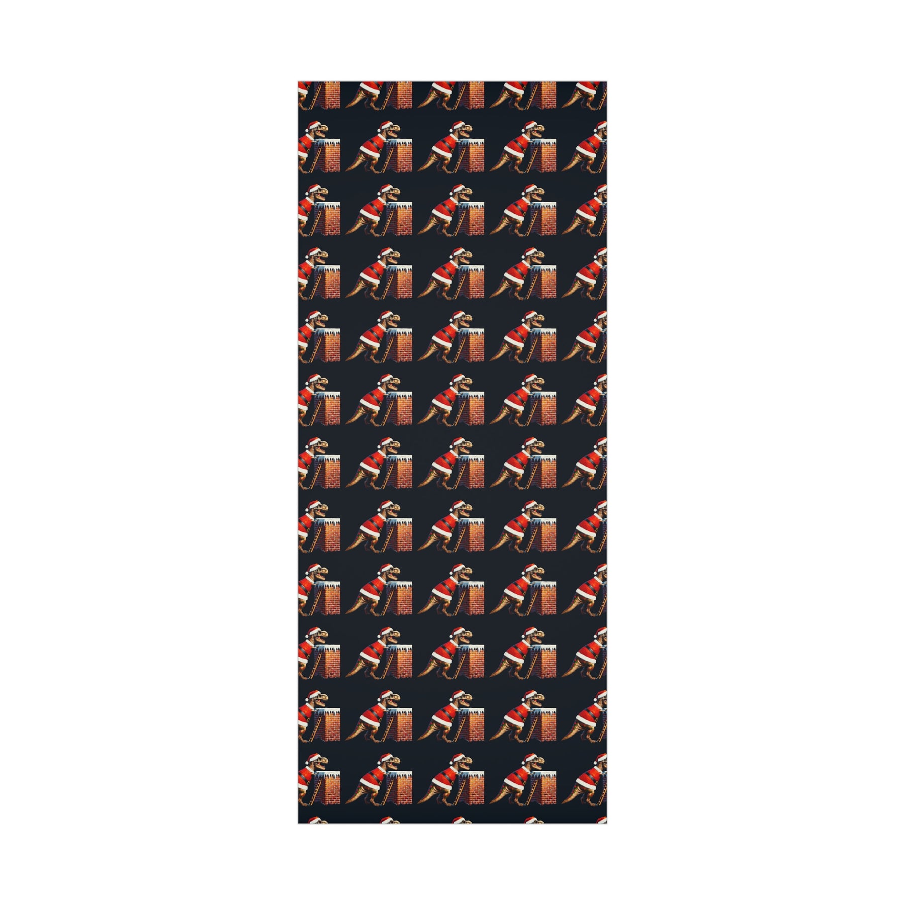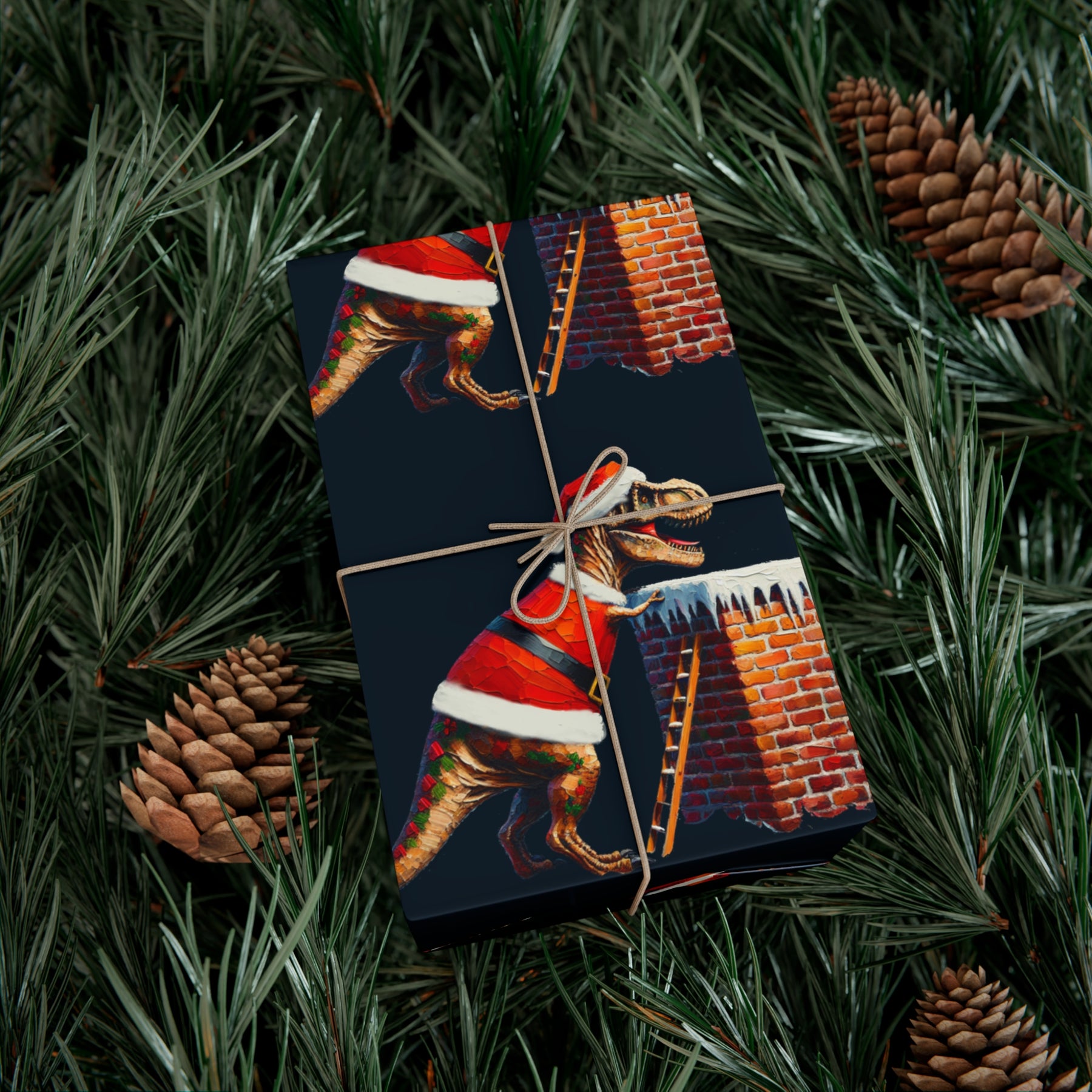 Gift wrap featuring a T-Rex in a Santa suit climbing a chimney.