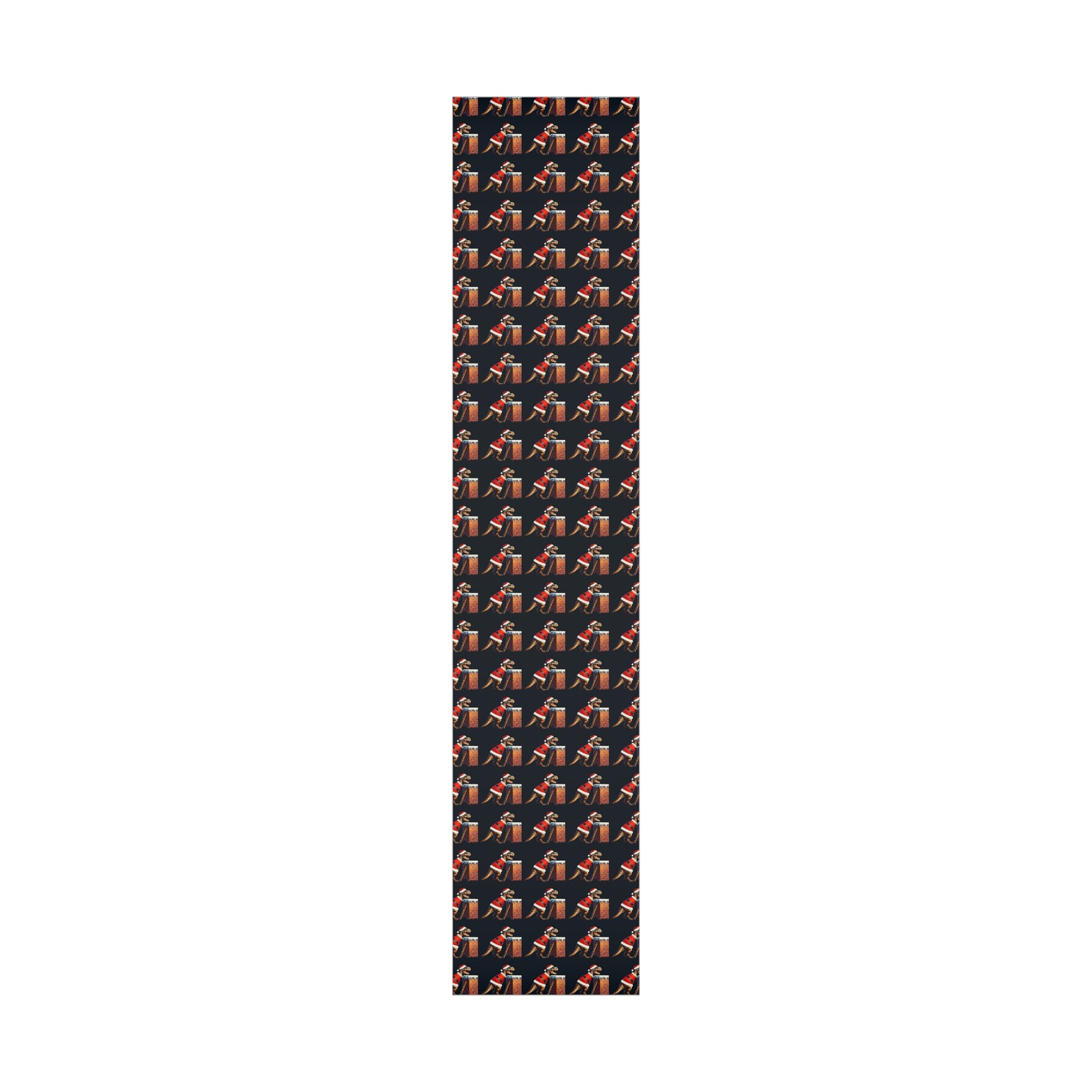 Gift wrap with a dark background featuring a repeating pattern of T-Rex dinosaurs in Santa hats climbing chimneys.