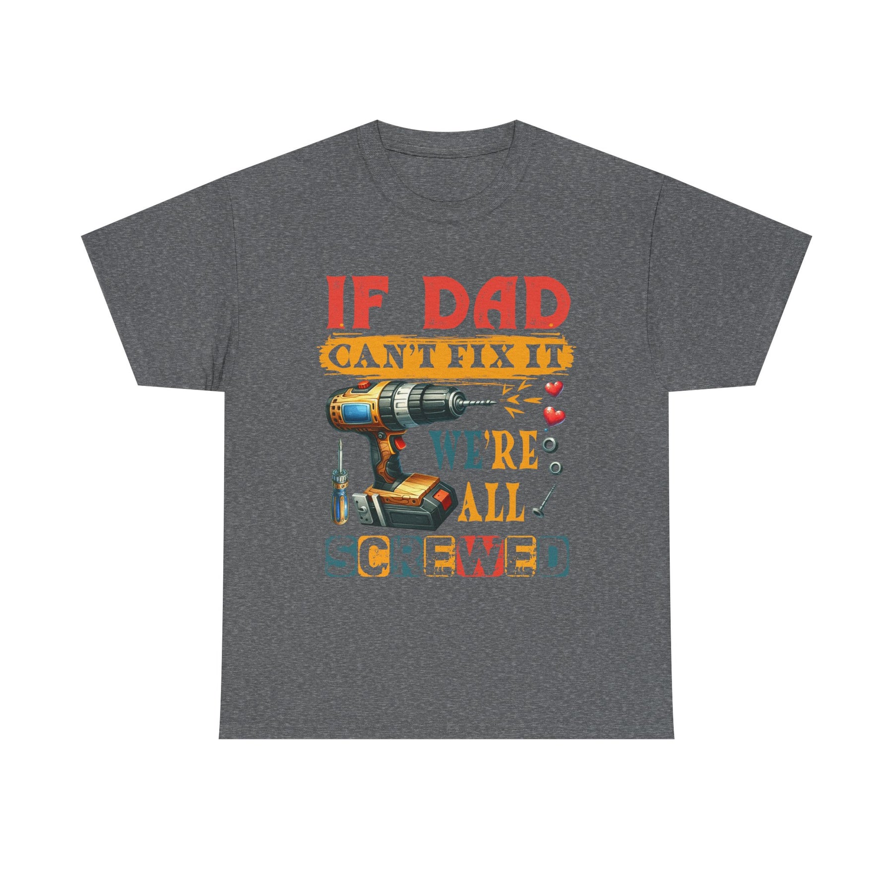 This T-Shirt with the humorous quote 'If Dad Can't Fix It We're All Screwed' is the perfect funny gift for Father's Day, give us a gift, or wear it yourselves as a fun surpise. Perfect for birthdays, or casual wear. It exudes a light-hearted vibe and is relevant to anyone with a sense of humor. The classic fit and comfy fabric make it a versatile piece for year-round wear.