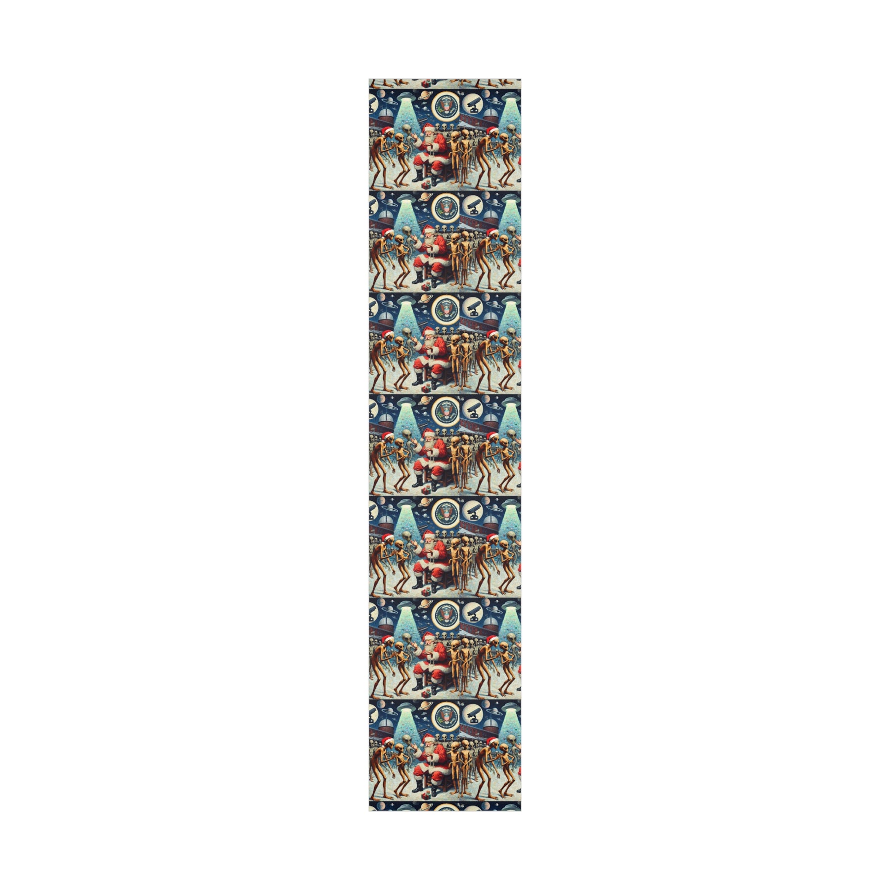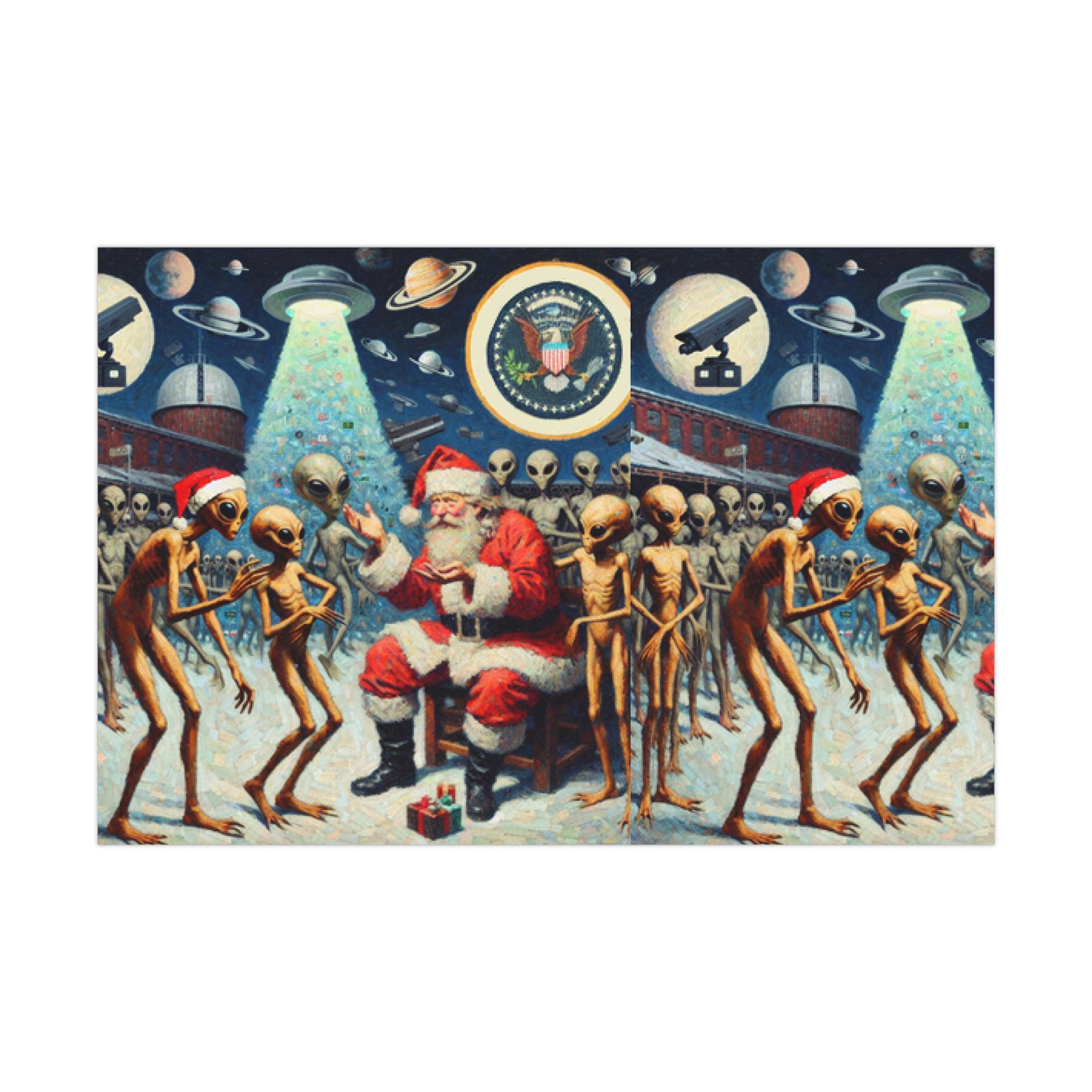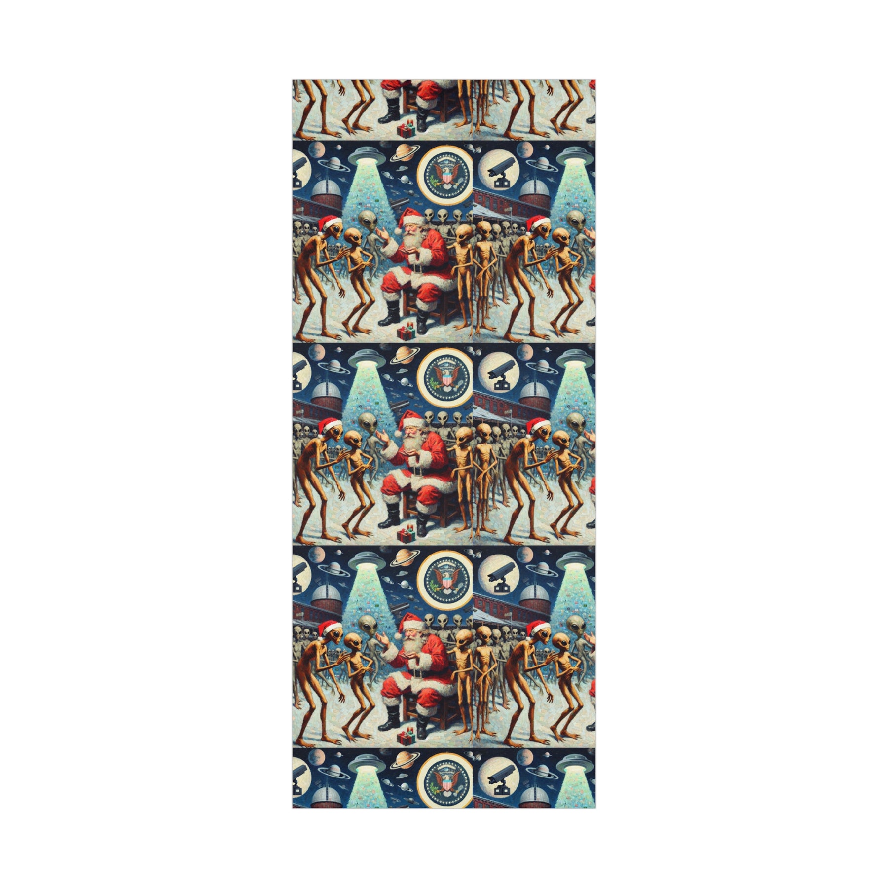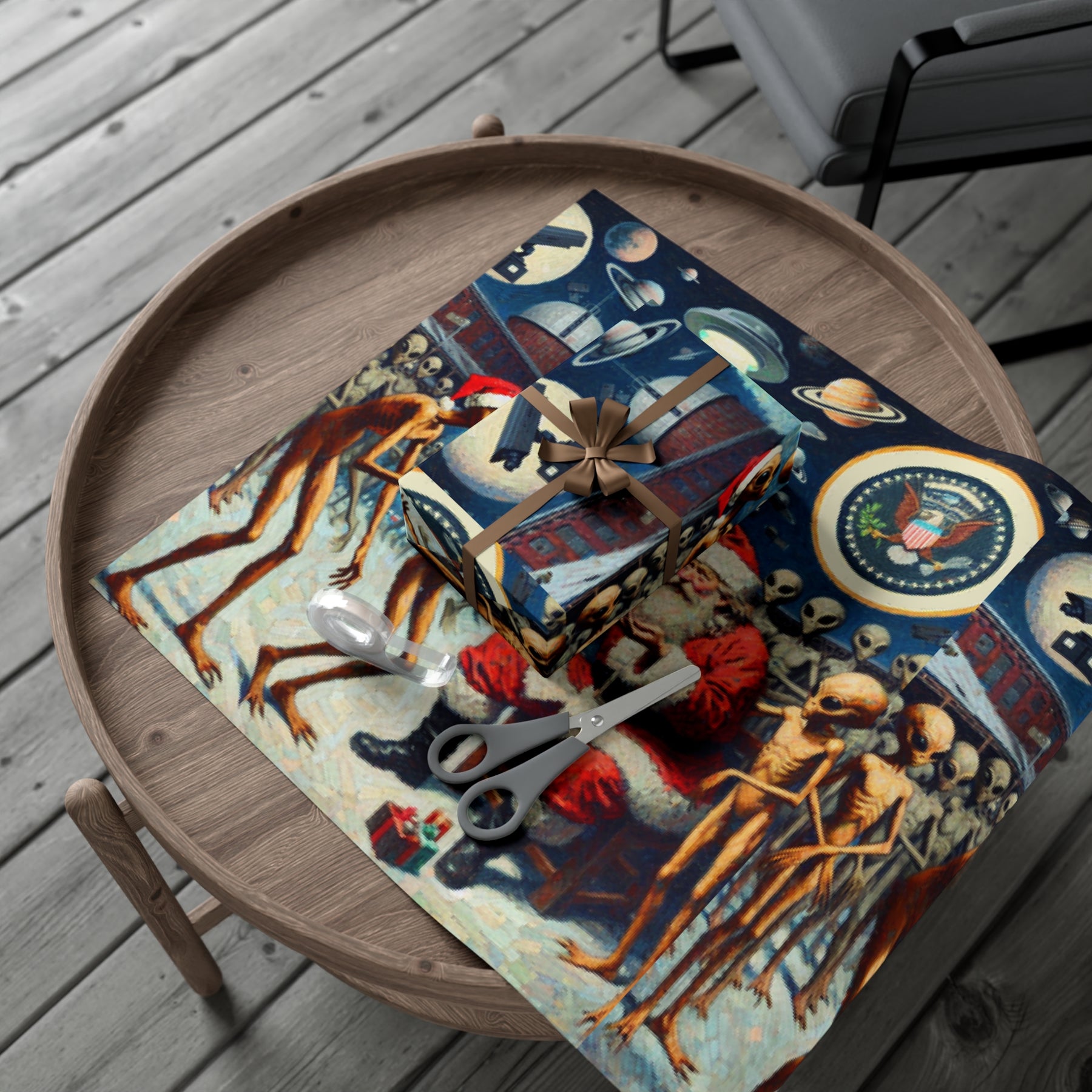 Vintage alien wrapping paper with Santa and conspiracy motifs.