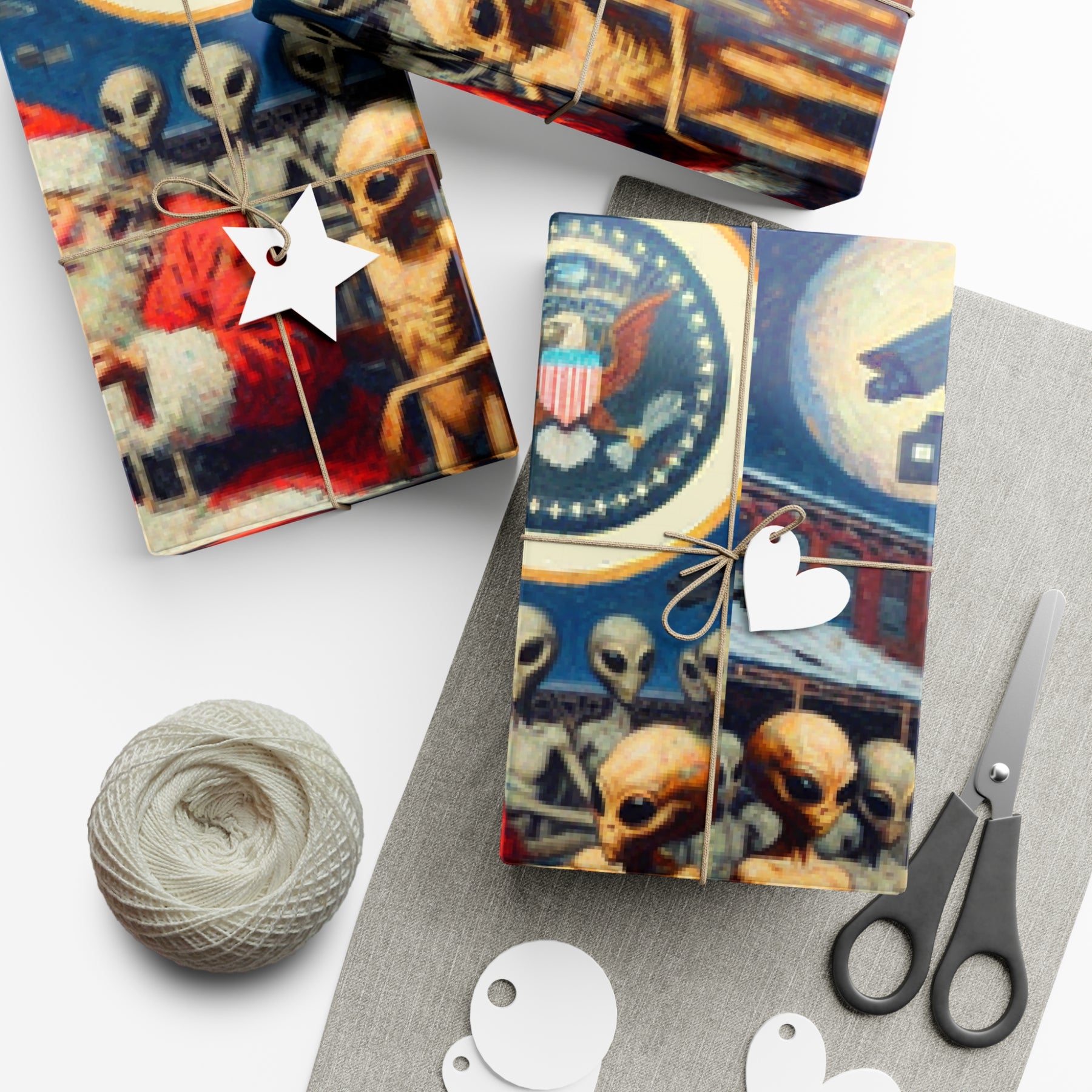 Vintage alien wrapping paper with Santa and patriotic symbols.